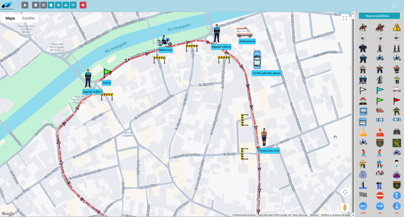 Planificación de eventos integrado con Google Maps. Podemos sobre el plano de la ciudad ubicar rutas, patrullas, Elementos para regulación del tráfico etcétera etcétera. Todo en un entorno visual sobre el mapa de la ciudad.Esta esta planificación se puede enviar por correo electrónico o Whatsapp a las personas interesadas e implicadas en el desarrollo del operativo del evento.