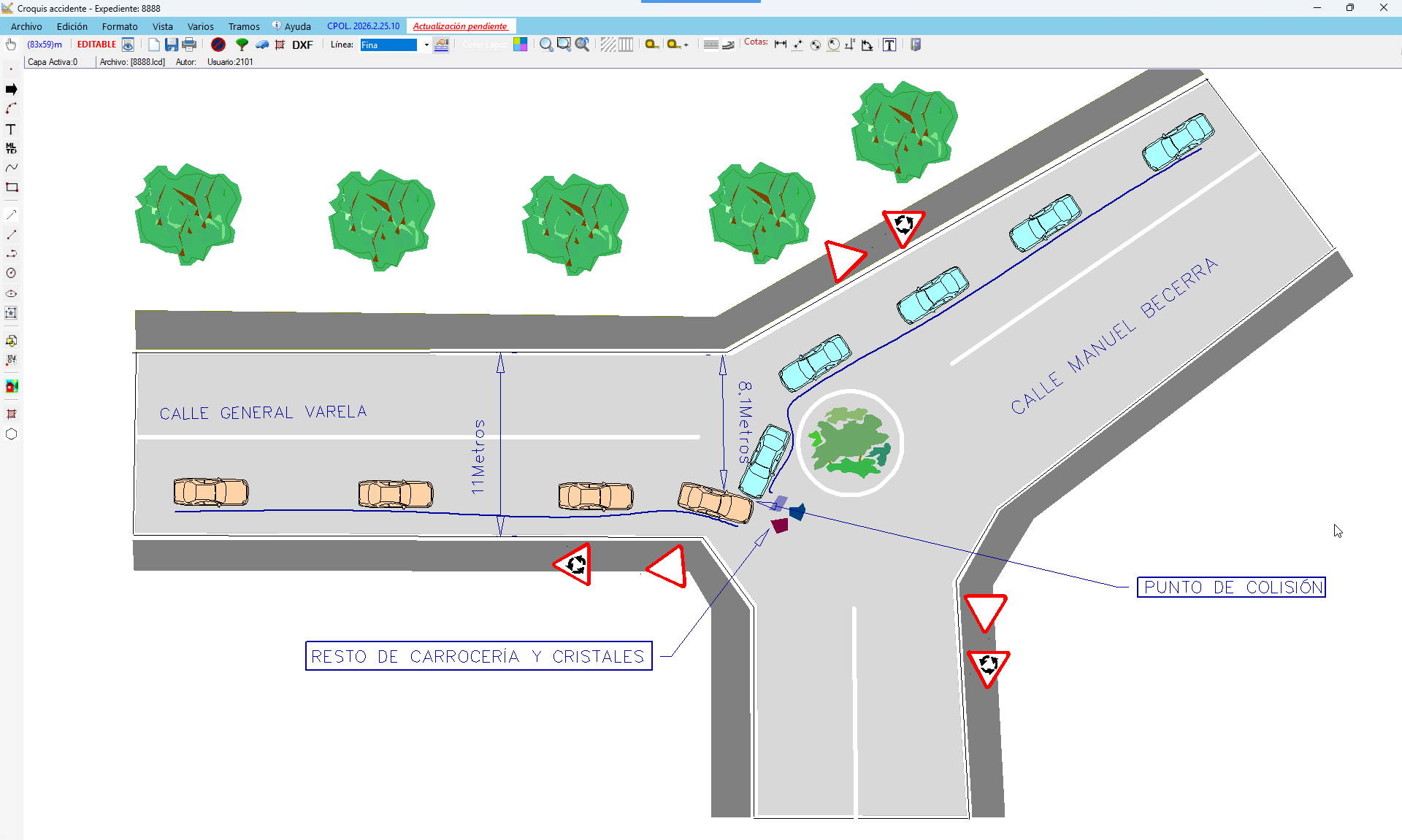 Completo sistema de gestión de croquis del accidente. El entorno de dibujo es un entorno vectorial, todos los objetos y elementos se posicionan sobre la base del plano de la ciudad en formato DXF escalado. Para la realización del croquis simplemente bastará con cargar el plano de la ciudad en la base hacer un zoom al lugar del accidente y ya tendremos el escenario escalado, solamente habrá que ubicar los objetos y efectuar las acotaciones pertinentes sobre el plano ya escalado y con las medidas ya obtenidas
